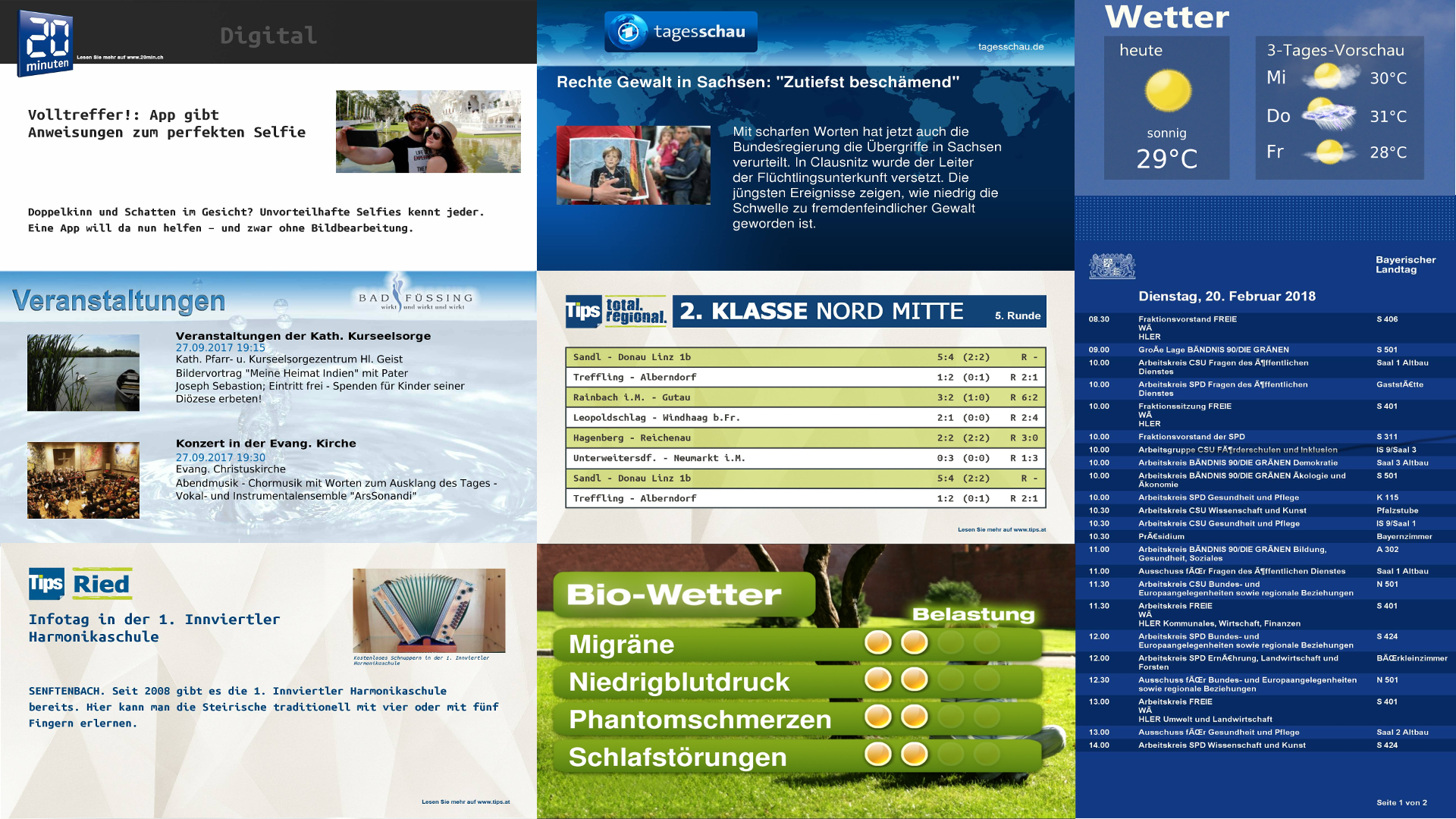 These playlists can be filled with your own pictures, videos and music as well as pre-generated news, weather or event information. In addition, our template editor allows you to design simple and reusable text and image content.